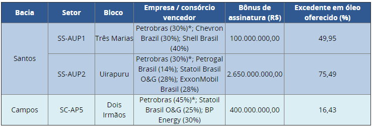 De acordo com a legislação atual, a Petrobras tem o direito de preferência para atuar como operadora nos blocos do pré-sal. A empresa optou por ser operadora nos três blocos arrematados.